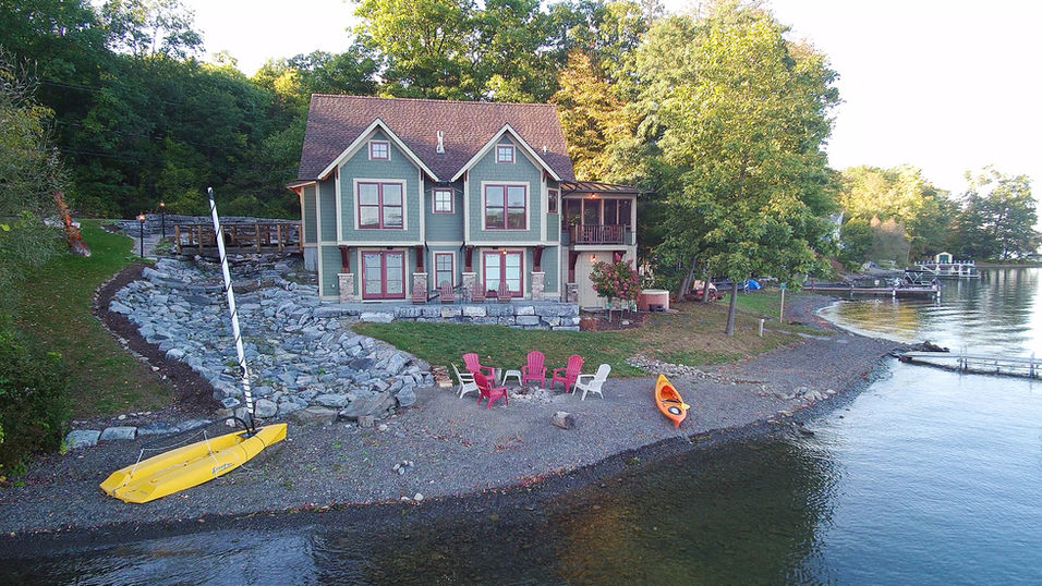 This property presented us with a unique challenge with a natural stream bed running directly through the building lot. We partnered with Mary Scipioni, RLA to install a new culvert under the public road and re-position the stream on the property. The result is a house that is "crooked" on the lot, but faces southeast for beautiful lake views. If you are interested in renting this property for a vacation getaway, select this link to contact Finger Lakes Premier Properties.